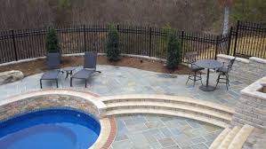Inground pools can be surrounded with cast cement pavers, natural stone pavers, concrete, patio tiles, wood, composite. While materials (like natural stone like slate and granite) can be expensive, stamped concrete decking can be used to mimic more expensive materials at a more budget-friendly price.